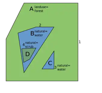 Forest A and thus multipolygon A stay unchanged: Relation A: type=multipolygon landuse=forest outer 1 inner 2 inner 3 Closed way 2 is now also untagged because there are no map features for the whole enclosed area anymore. Lake B which is tagged with natural=water is now the blue ring: the area enclosed by way 2 minus the island D. This is described by a second multipolygon B: Relation B: type=multipolygon natural=water outer 2 inner 4 |