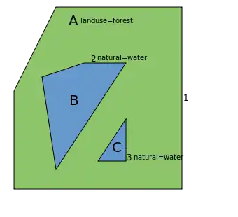 | Closed way 3 is added within forest A and tagged with natural=water describing lake C. Forest A which is tagged with landuse=forest isn't a simple ring anymore. It's now the area enclosed by way 1 minus lakes B and C.