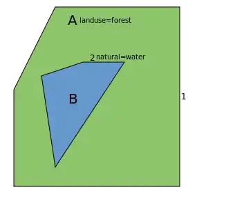 | Closed way 2 is added within forest A and tagged with natural=water describing lake B. Closed way 1 is now untagged because there are no map features for the whole enclosed area. It doesn't represent something on its own. Forest A which is tagged with landuse=forest is the green ring: the area enclosed by way 1 minus the lake B.