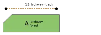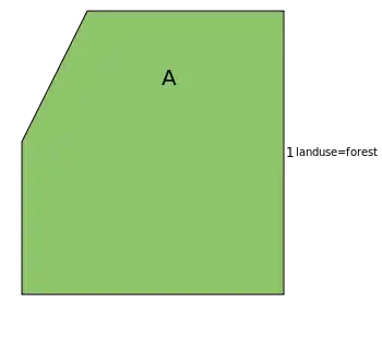 | Closed way 1 is drawn and tagged with landuse=forest describing forest A. Tagging a closed way with a tag indicating an area results in drawing an area. This kind of shortcut works for simple areas the outline of which consists of one single way, and which do not have holes. The same could be done with a multipolygon but this would just complicate a simple case. | ![]() Forest (One closed way) |