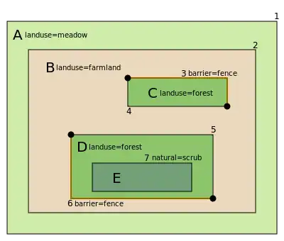 Multipolygon A describes the meadow A, multipolygon B the farmland B, multipolygon C the forest C and multipolygon D the forest D: Relation A: type=multipolygon landuse=meadow outer 1 inner 2 Relation B: type=multipolygon landuse=farmland outer 2 inner 3 inner 4 inner 5 inner 6 Relation C: type=multipolygon landuse=forest outer 3 outer 4 Relation D: type=multipolygon landuse=forest outer 5 outer 6 inner 7 |