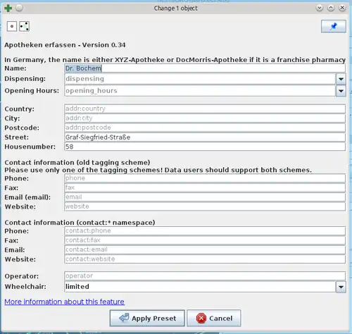 Zum Erlernen von JOSM Vorlagen wurde diese Vorlage für die Apotheken Wochenaufgabe erstellt