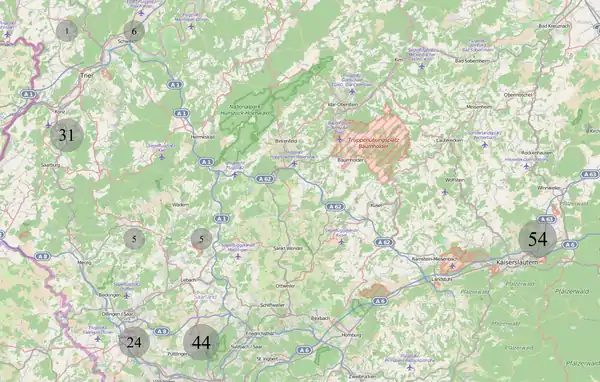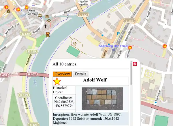 | Stolpersteinkarte als Teil der Geschichtskarte http://www.historic.place/themes/stolpersteine/index.html?zoom=10&lat=49.62063&lon=7.15425&layers=B0000TT |