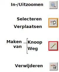 - 1. Gebruik het gereedschap Knopen tekenen en klik om knopen te plaatsen. Wegsegmenten zullen de knopen verbinden (sneltoets = 'A').