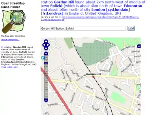 Furthermore, you can find the distance between two results by putting a colon between them. So Hinton Road, Fulbourn: Crossings Road, Chapel-en-le-Frith will look up both and tell you how far it is between them.