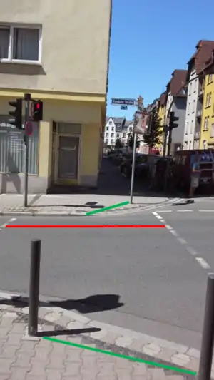 - Diese beiden Linien orientieren sich an die Länge des abgesenkten Boardsteines - es gilt diese zu vermessen. Hinweis: Nicht immer ist die Länge des abgesenkten Bordsteines zugleich auch die nutzbare Fläche, da diese z.B. durch Gehwegposten oder Verkehrschilder beschrenkt werden kann. In diesem Fall wird die Länge durch zwei nebeneinanderstehende Gehwegpfosten bestimmt (untere Linie) oder die längste Länge zwischen einer Bordsteinabsenkung bis zu einem Hinterniss (obere grüne Linie).