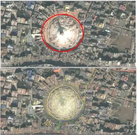 Below it is clear the shape of the shadow identifies the shape of the building. Displacements due to high rise buildings must also be taken into consideration.