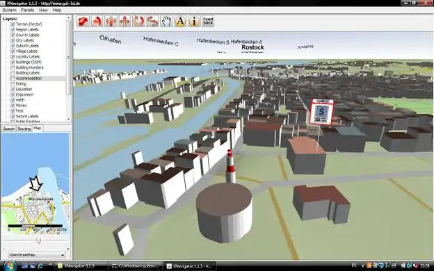 The web client that is used in OSM-3D is called XNavigator. It has been mainly developed as client for the W3DS reference implementation, but it also allows access to a couple of complementary OGC services. Hence it is sometimes also referred to as "integrated client", but in the OSM-3D project its main purpose is to fly through the city and landscape models without the need to install or configure anything.