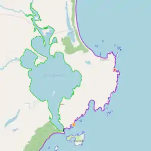 All data in this view is derived from OSM data. The OSMCoastline program is used to assemble the coastline data and all errors that show up in this process are shown in this view.