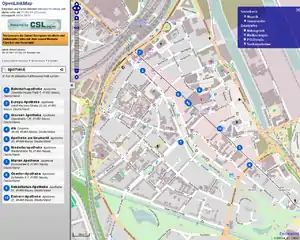 OpenLinkMap is a web application visualizing additional information on a OpenStreetMap background map.