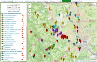 Osmose is build upon a Slippy Map. The number of displayed issue markers is limited. Zoom to show more. The markers on the map will open a popup on click.