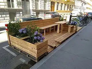 - Parklets that serve as areas for outdoor gastronomy and are intended for the customers of the associated business: leisure=outdoor_seating + outdoor_seating=parklet
