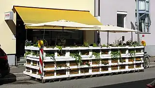 | Typical parklet with seatings open to the general public. | Planter designed as a parklet. | Parklet providing outdoor seating in front of a restaurant. |