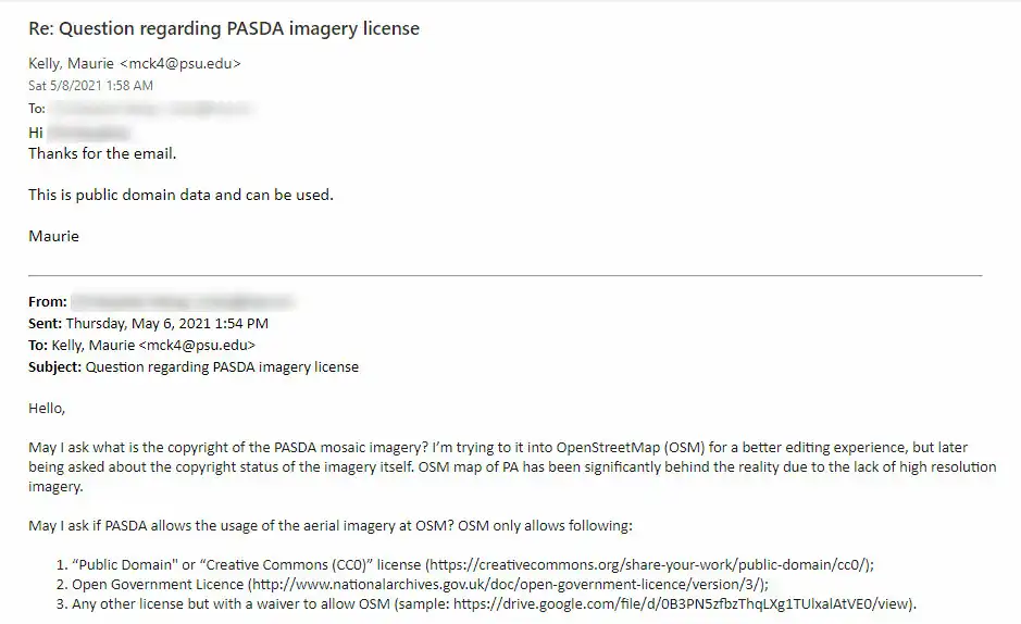 PASDA Director Maurie C. Kelly has approved the imagery usage in OpenStreetMap as public domain data. A proof has been obtained and uploaded to the OpenStreetMap Wiki.
