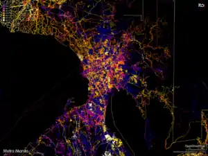 Node density in the Philippines. This is a visualization of the node density of OSM data in the Philippines taken from the 2012-01-02 extract. Each pixel represents a 0.01°×0.01° degree square or approximately 1 square kilometer. Brighter pixels represent areas with higher node counts. As expected, brighter areas are places with a large population, where there is a large amount of editing, and where there is available high-resolution imagery since there would be more features (such as buildings) that can be traced. An example in is the conurbation of Metro Manila. | |