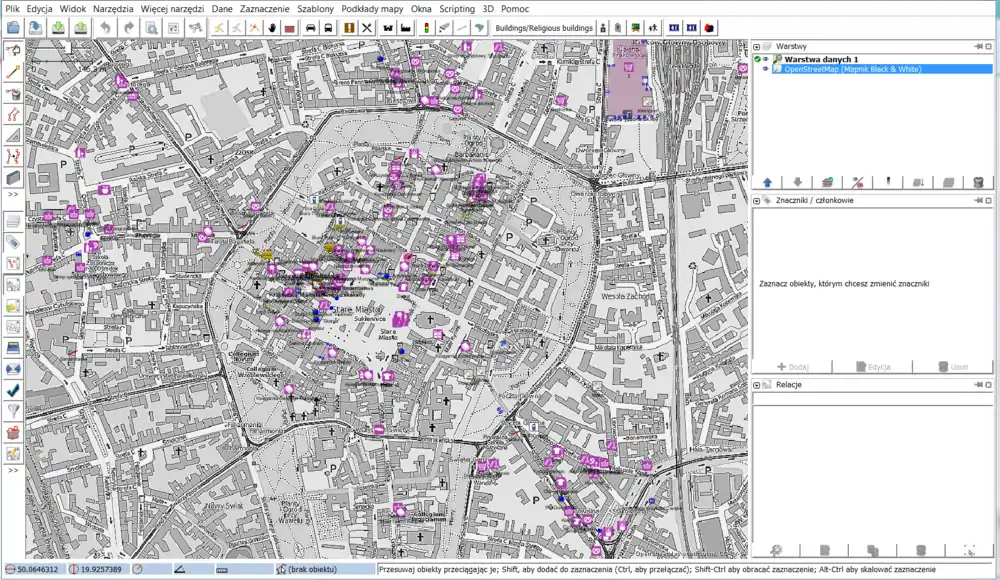 W tym celu instalujemy w JOSM wtyczkę "mirrored_download" i jako tapetę, standardową czarno-białą mapę OSM. Następnie pobieramy przefiltrowane dane.