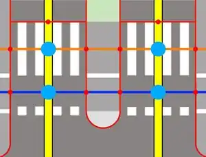 Rysujemy obszar wokół skrzyżowania ulic, traktując przejście jako jego krawędzie i oznaczamy je: