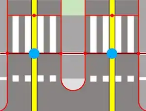- Nie rysujemy obszaru area:highway=cycleway dla przejść dla rowerów. Prawidłowe oznaczanie ich jest wyjaśnione w drugiej tabeli poniżej.