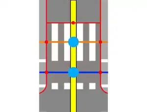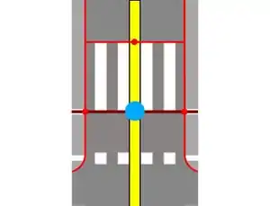 area:highway=* (klasa drogi, np. area:highway=primary) Jeśli jest to pojedyncze przejście z dala od skrzyżowania ulic, rysujemy je tak samo liniowo, jak obszar ulicy prostopadłej bez tagu junction=yes.