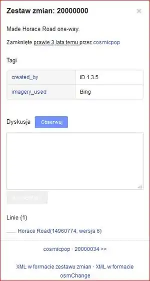 Zestawienie zmian można bezpośrednio uzyskać za pomocą następującego schematu URL: https://www.openstreetmap.org/changeset/Numer_zestawu_zmian.