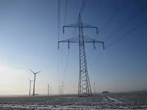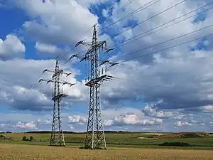 The transmission network usually uses steel lattice pylons. There are three voltages: