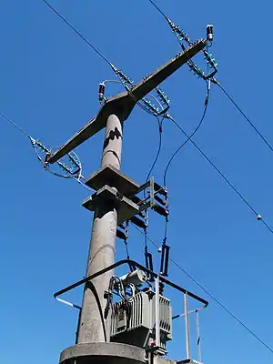 The distribution network lines operate at 20 kV in most rural regions and are installed on wooden, concrete or small metal poles. 3 or 6 single wires, usually no ground wire. Single remote houses or farmyards may be supplied by 950 V lines of similar appearance.