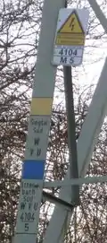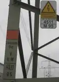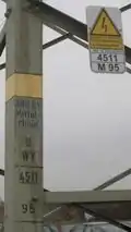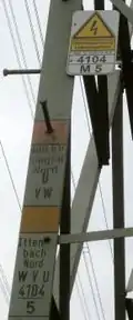 • Ein großes M. Dieses scheint erst mit den reflektierenden Schildern eingeführt worden zu sein (zumindest was die Sichtbarkeit am Mast selber betrifft). Im VEW-Altnetz kan auch der erste Buchstabe der Ziel-Umspannanlage hier stehen (z.B. H für Herne).