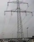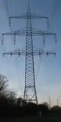 Blick auf einen Mast mit zwei Stromkreisen von vorne.
