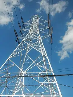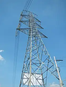 | 500 kV | 9 | Transmission | Extra-high-voltage line voltage in Luzon and the highest operating voltage of the Philippine power grid since 1994. | Very tall lattice towers and steel poles (with the latter are rarely used) ranging from a height of 27–46 meters (89–151 ft). Lines use quadruple-bundle conductors. | ![]() ![]() |