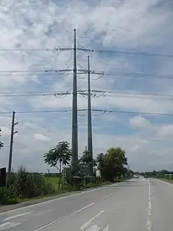| 20/34.5 kV | 4 | Distribution | Mostly used for distribution by Meralco in most of its coverage area. Other distributors operating lines with this voltage are CEPALCO (in Cagayan de Oro), and LIMA Enerzone (at LIMA Technology Center in Lipa and Malvar, Batangaso) | Medium-size poles, usually placed roadside. Multiple wires and circuits may not be obvious from imagery. Networks form large webs of lines with many branches that may carry one or two wires. Step-down transformers normally mounted on poles. Structures typically from 12–18 meters (39–59 ft), with taller poles used in major river crossings and smaller poles in narrow streets | |