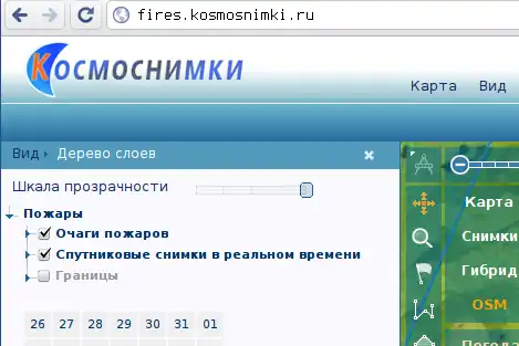 - Visit http://fires.kosmosnimki.ru/. Check that you have “Очаги пожаров” (“Fire epicenters”) and “Спутниковые снимки в реальном времени” (“Real-time imagery”) enabled, and also that you have selected the date you need: