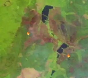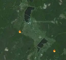 - Check that what you see is really a result of fire, and not something that has been there already for a long time. Enable the “Снимки” (“Imagery”) layer and disable “Снимки в реальном времени” (“Real-time imagery”) layer for some time. If you see woods or field at those usual images, and something brown at the real-time images, it's most likely the “burnt place” (term courtesy Komzpa).
