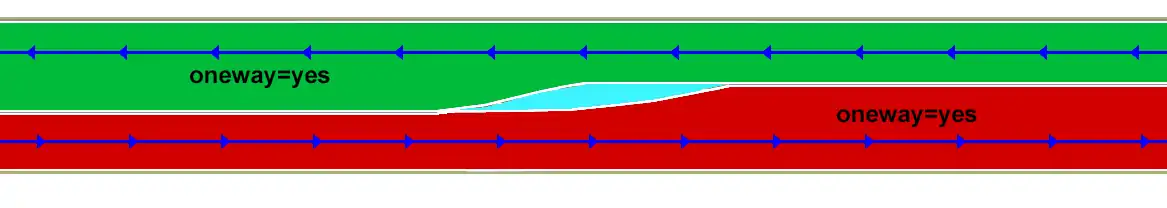 We need also two separate oneways (note that it NOT an accepted tagging to split road into two oneways in such case):