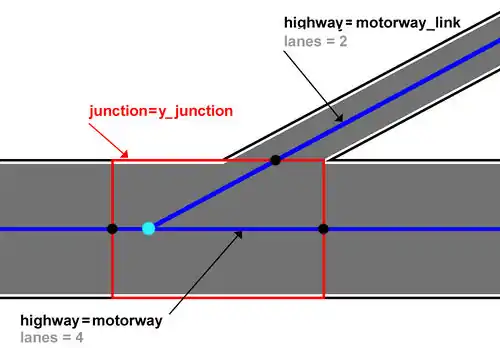 Example of behaviour of rendering of areas with junction=y_junction tag: