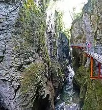 A gorge is a vertical and narrow crevasse made by a river or any other strong water flow. They are mostly in valleys and not "part of a cliff" (see the "gorge du Fier" for example).