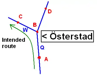 Lets say I'm approacing the crossing in the photo on the top of this page and the routing software says that I should turn left. It would be an additional aid to know that I want to follow the sign to Österstad. This aid becomes increasingly helpful when following a larger road with many exits or crossing ways.