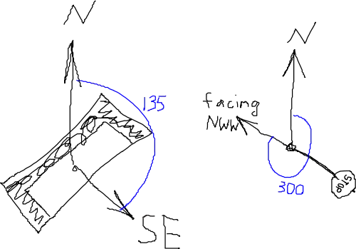 For asymmetric areas or point features, this gives the compass direction of the asymmetry or which direction the node object points towards. The direction could be measured by a compass or determined visually. North on the map means top side, the direction of increasing latitude, or y coordinate in google projection.