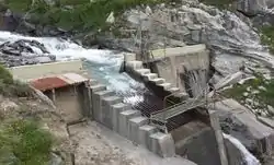 Such a dam is intended to divert part of a river into a tunnel leading to power plant turbines. About 3.5 m3 per seconds go into the intake while only 0.6 remain in the natural environment.