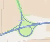 | junction=parclo or junction=partial cloverleaf; implies junction=exchange | A cloverleaf exchange that has fewer than 4 leaves. | ![]() |