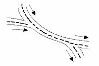 | junction=braid or junction=weave; implies junction=slip | A braid is a short section of one-way road where traffic "weaves"; two roads join into the braid (in an inverted "Y" shape), and then the braid splits into another two roads (in a "Y" shape). Usually, the traffic coming from the left will depart to the right, and vice versa (hence the term). (Note: In USA engineering terms, "braiding" is an arrangement, typically involving at least one bridge, specifically to avoid a "weave" configuration as described here.) | ![]() |