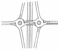| junction=stack; implies junction=exchange | A four-way exchange with no leaves or weaving, and paired (simmetric) slipway bridges (or even tunnels). | ![]() |