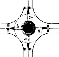 It is different from a roundabout in the sense that a traffic circle is generic, and a roundabout has certain rules regarding vehicle priority. Traffic circles in which the traffic priority scheme is different from a roundabout should be tagged as traffic circles. (Image shows "give way" signals, not direction arrows) |
