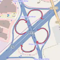 | junction=cloverleaf; implies junction=exchange | You already know what a cloverleaf is. Two motorways (or freeways), four external slipways, four leaves. | ![]() |