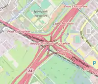 | junction=diamond; implies junction=exchange | One motorway; two on-ramps; two off-ramps. The ramps merge at a non-motorway on a bridge or tunnel. | ![]() |