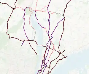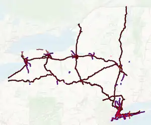 New York State Highways: 3, 5, 7, 8, 9A, 9G, 9H, 10, 12, 12A, 13, 14, 15, 16, 17, 21, 22, 23, 24, 25, 26, 27, 28, 29, 30A, 31, 32, 33, 33A, 35, 36, 37, 39, 42, 50, 52, 56, 58, 59, 60, 63, 77, 78, 100, 104, 109, 130, 149, 179, 199, 204, 205, 231, 263, 303, 332, 365, 370, 384, 408, 481, 495, 812, 878