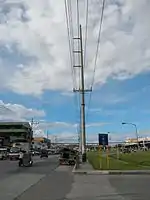 ![]() Three-level pole on branching point of roadside 69,000 volt line by National Grid Corporation of the Philippines, Laguna, Philippines |