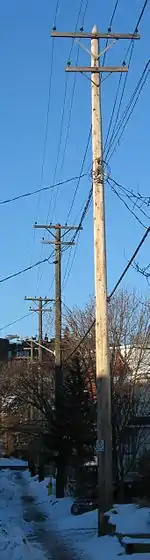 ![]() Two-level pole supporting two 12,470Y/7,200 volt circuits, Ontario, Canada |