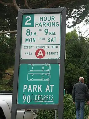 Vehicles have to park diagonally. Also known as angle parking or echelon parking. | |