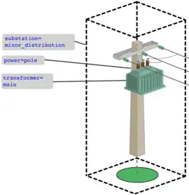 We are dealing here with simple enough substations to be mapped on a node as to not clutter the map with a lot of power features. They mostly contain a single main transformer (and no auxiliary one), optional compensator, a few protective equipment and cables inbound.