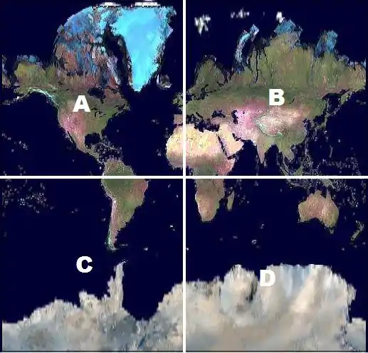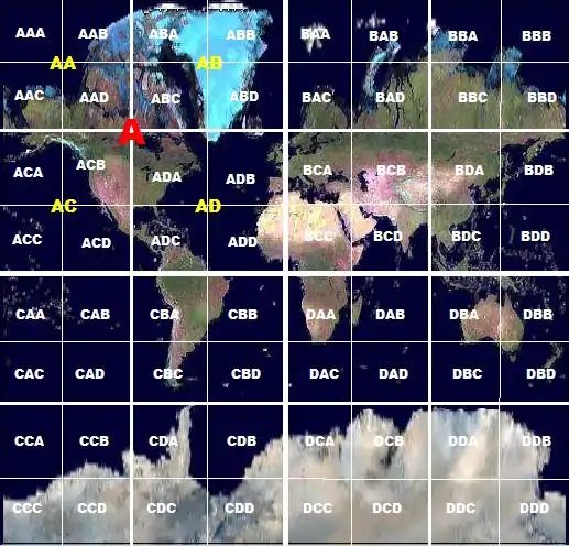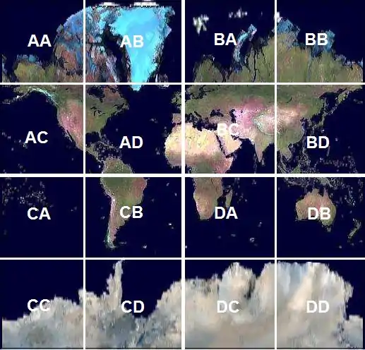 For example, if we use a shorthand for each XY pair of 00=A 01=C 10=B 11=D; observe the globe split into tiles: